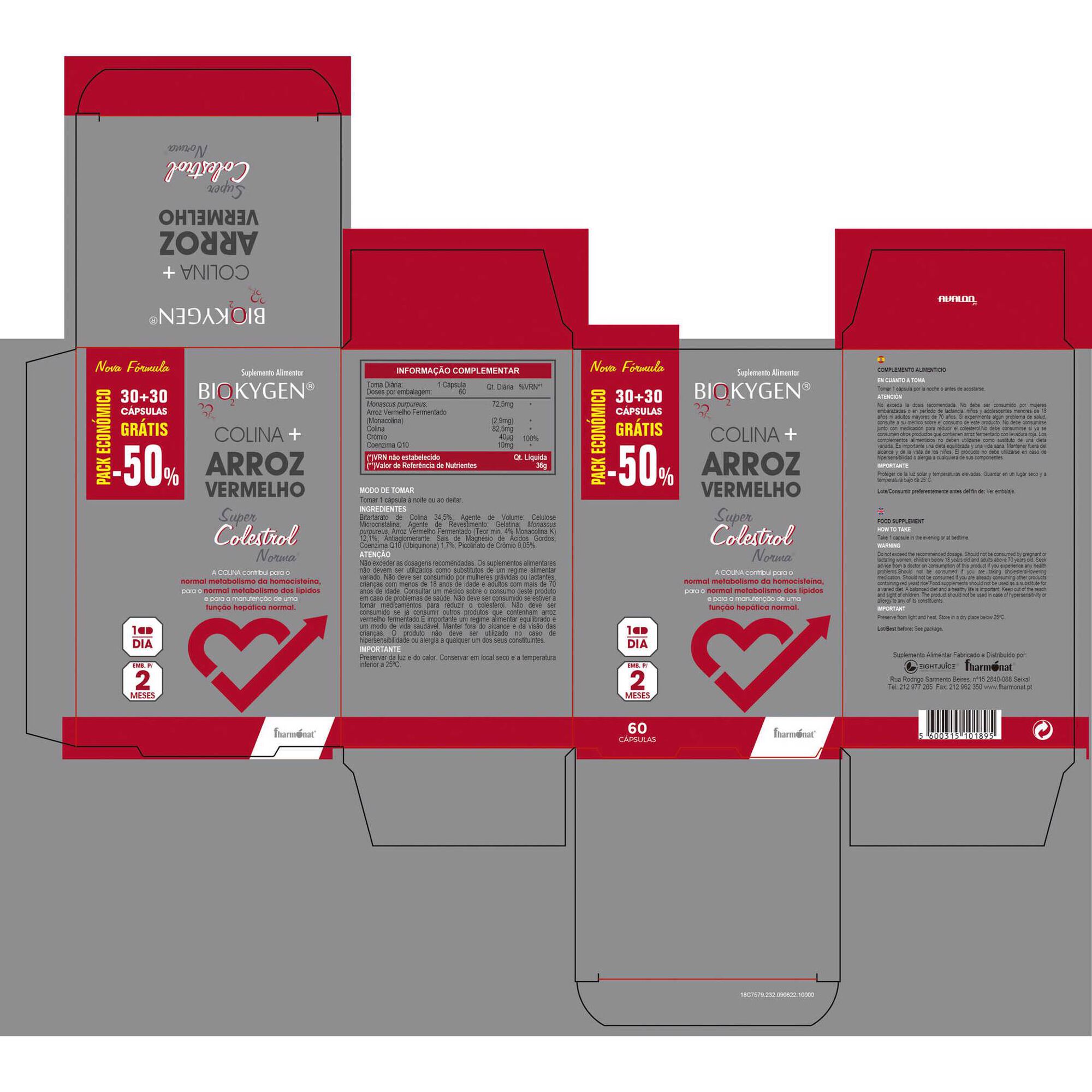 Bitartarato de Colina 34,5%; Agente de Volume: Celulose Microcristalina; Agente de Revestimento: Gelatina; Monascus purpureus, Arroz Vermelho Fermentado (Teor min. 4% Monacolina K) 12,1%; Antiaglomerante: Sais de Magnésio de Ácidos Gordos; Coenzima Q10 (Ubiquinona) 1,7%; Picolinato de Crómio 0,05%.