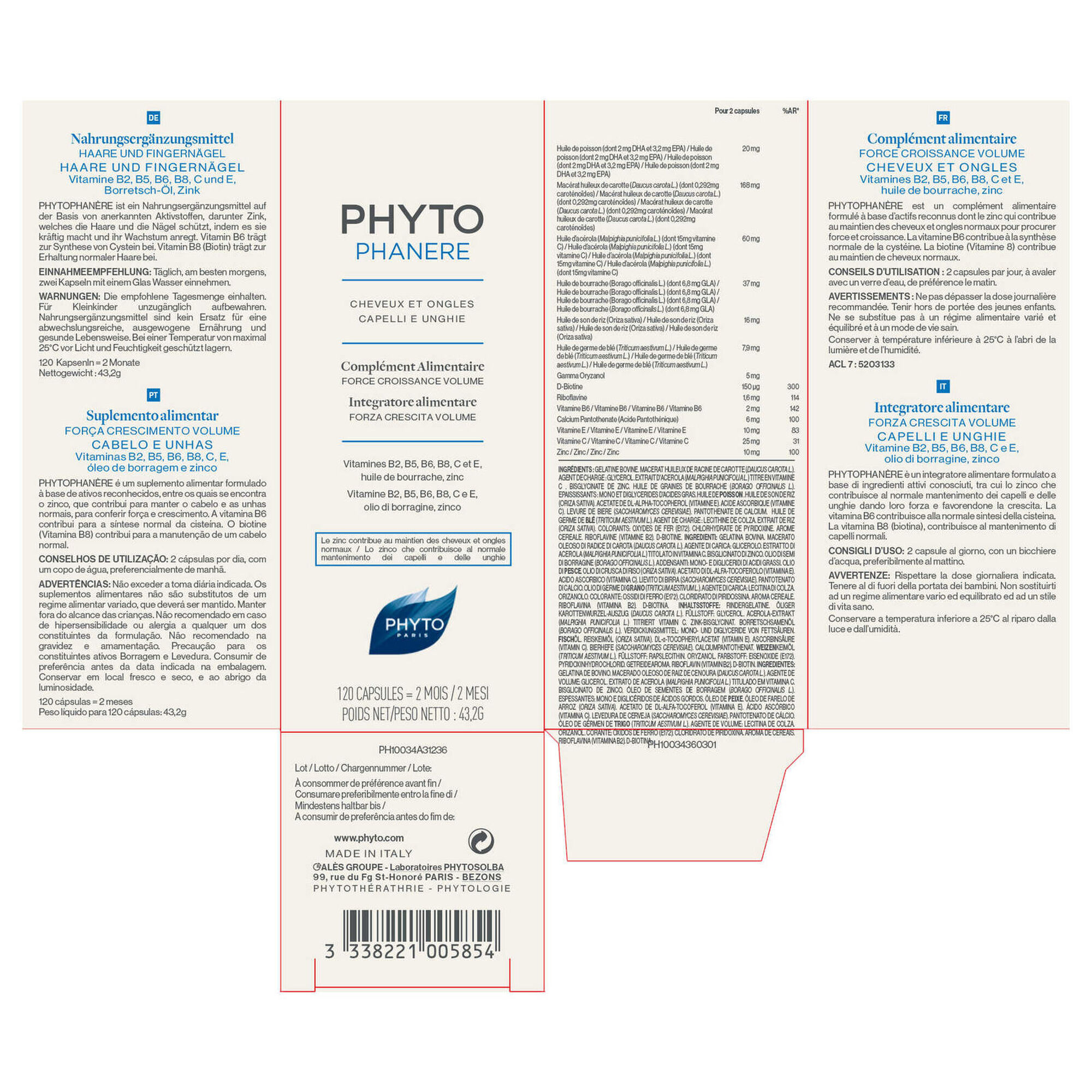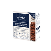 Phytophanère Cápsulas, com Vitaminas B2, B5, B6, B8, C e E, óleo de borragem e Zinco, é um suplemento alimentar dedicado à força e ao crescimento do cabelo e das unhas. A Vitamina B6 contribui para a síntese de cisteína (constituinte da queratina), enquanto a Vitamina B8 e o Zinco participam na beleza e na sua qualidade do cabelo.