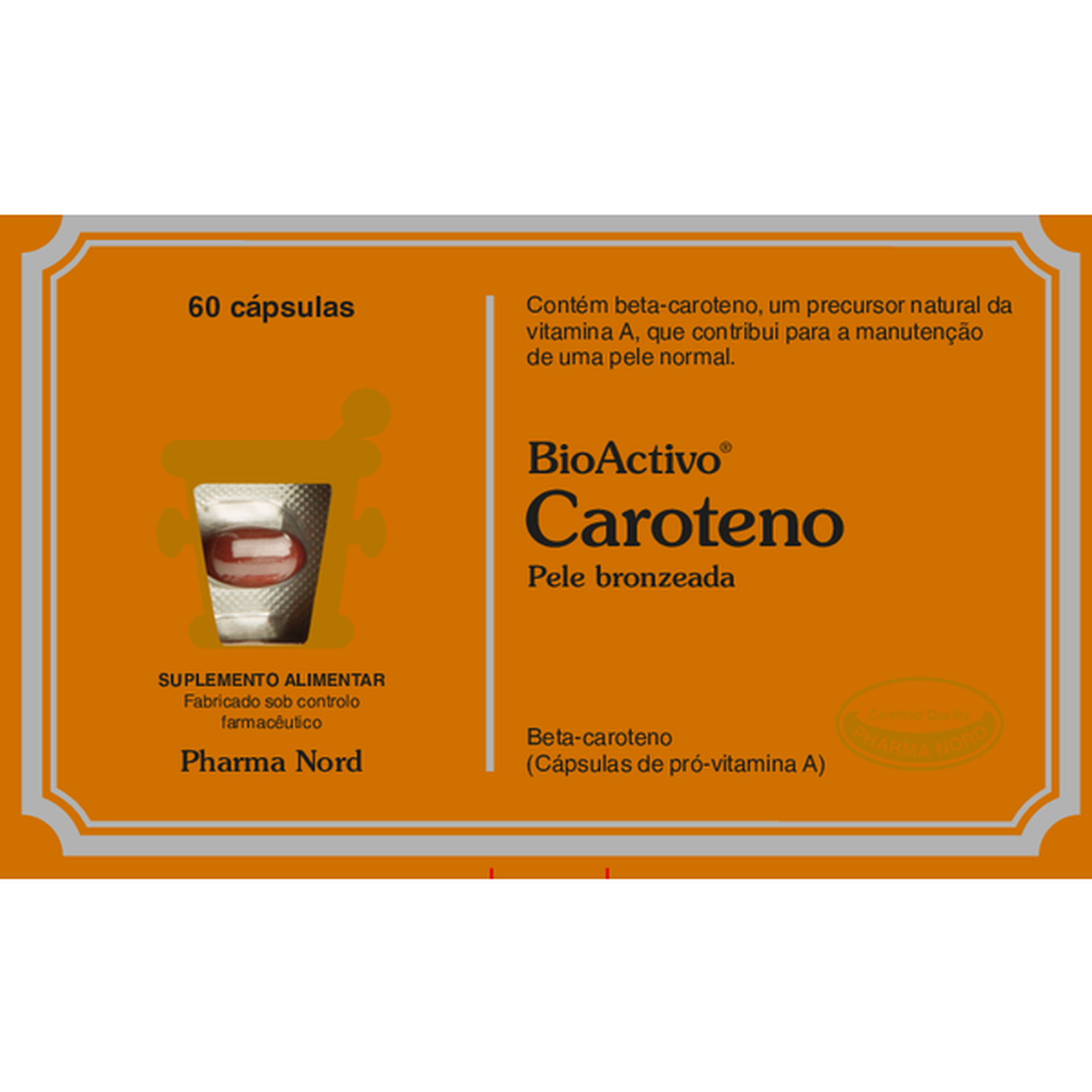 Suplemento alimentar que contém beta-caroteno, um precursor natural da vitamina A, que contribui para a manutenção de uma pele normal.