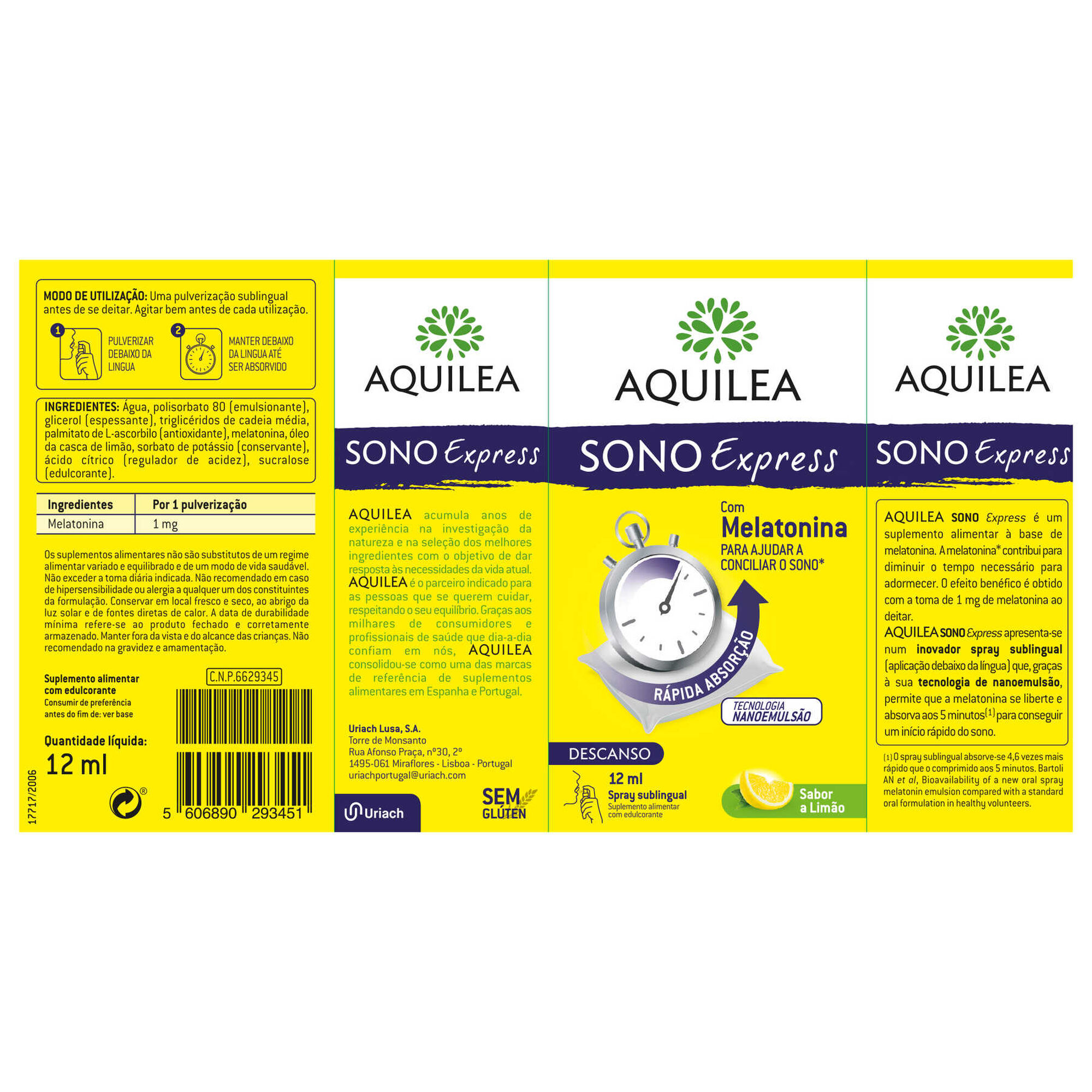 AQUILEA SONO Express é um Suplemento Alimentar à base de melatonina. A melatonina* contribui para diminuir o tempo necessário para adormecer. O efeito benéfico é obtido com a toma de 1 mg de melatonina ao deitar. O spray sublingual absorve-se 4,6 vezes mais rápido que o comprimido aos 5 minutos.