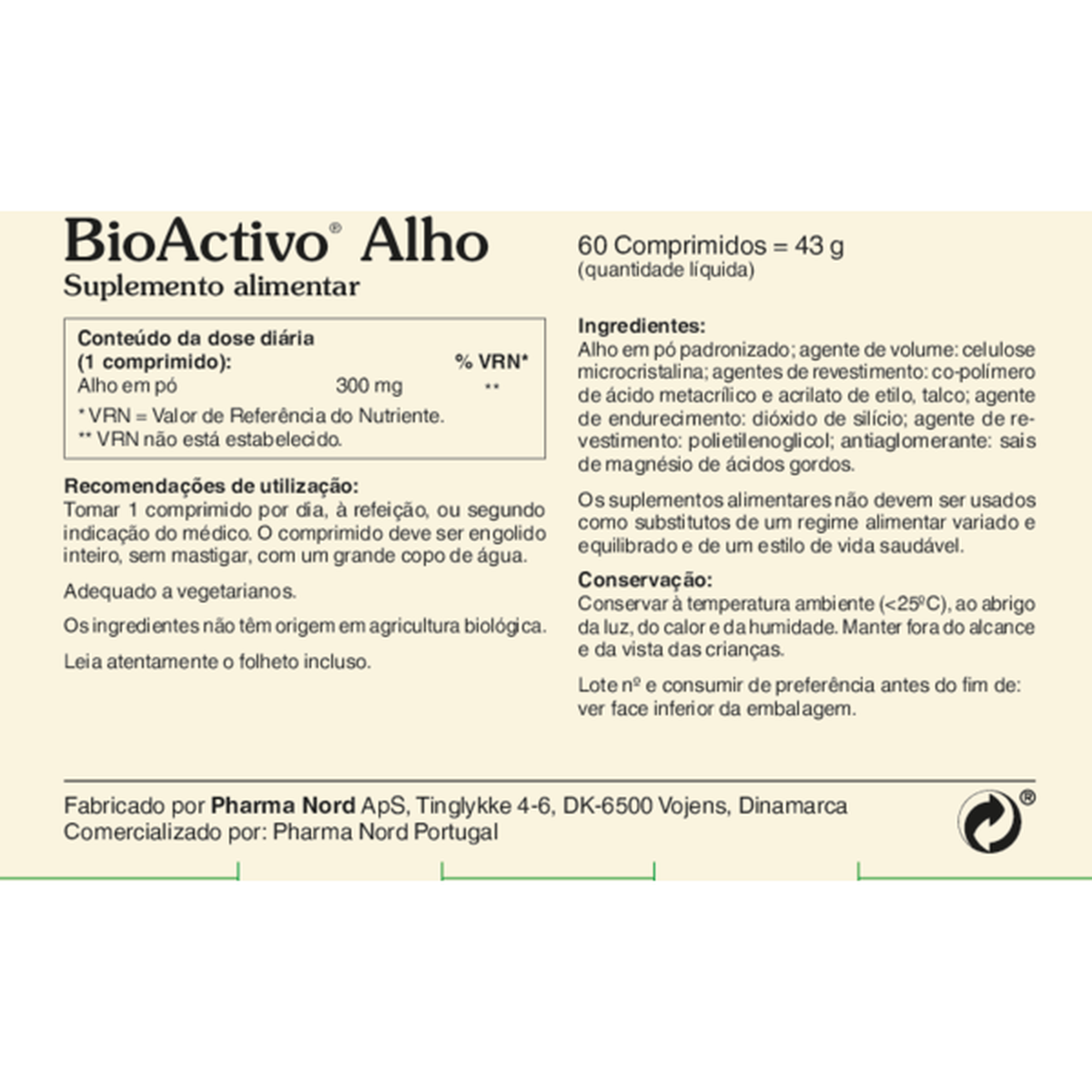 Alho em pó padronizado, agente de volume: celulose microcristalina, agentes de revestimento: co-polímero de ácido metacrílico e acrilato de etilo, talco, agente de endurecimento: dióxido de silício,agente de revestimento: polietilenoglicol, antiaglomerante: sais de magnésio de ácidos gordos.