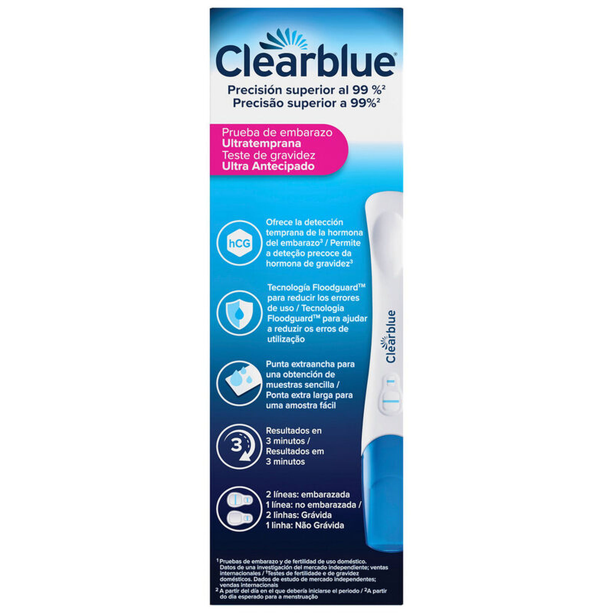 O teste de gravidez Clearblue Antecipado é um teste sensível, o que significa que pode efetuar o teste até 6 dias antes da sua menstruação em falta (ou seja, 5 dias antes do dia esperado para a menstruação). A Clearblue apresenta um design ergonómico, incluindo uma vareta curva mais longa e uma ponta com alteração da cor larga. Dispositivo Médico.