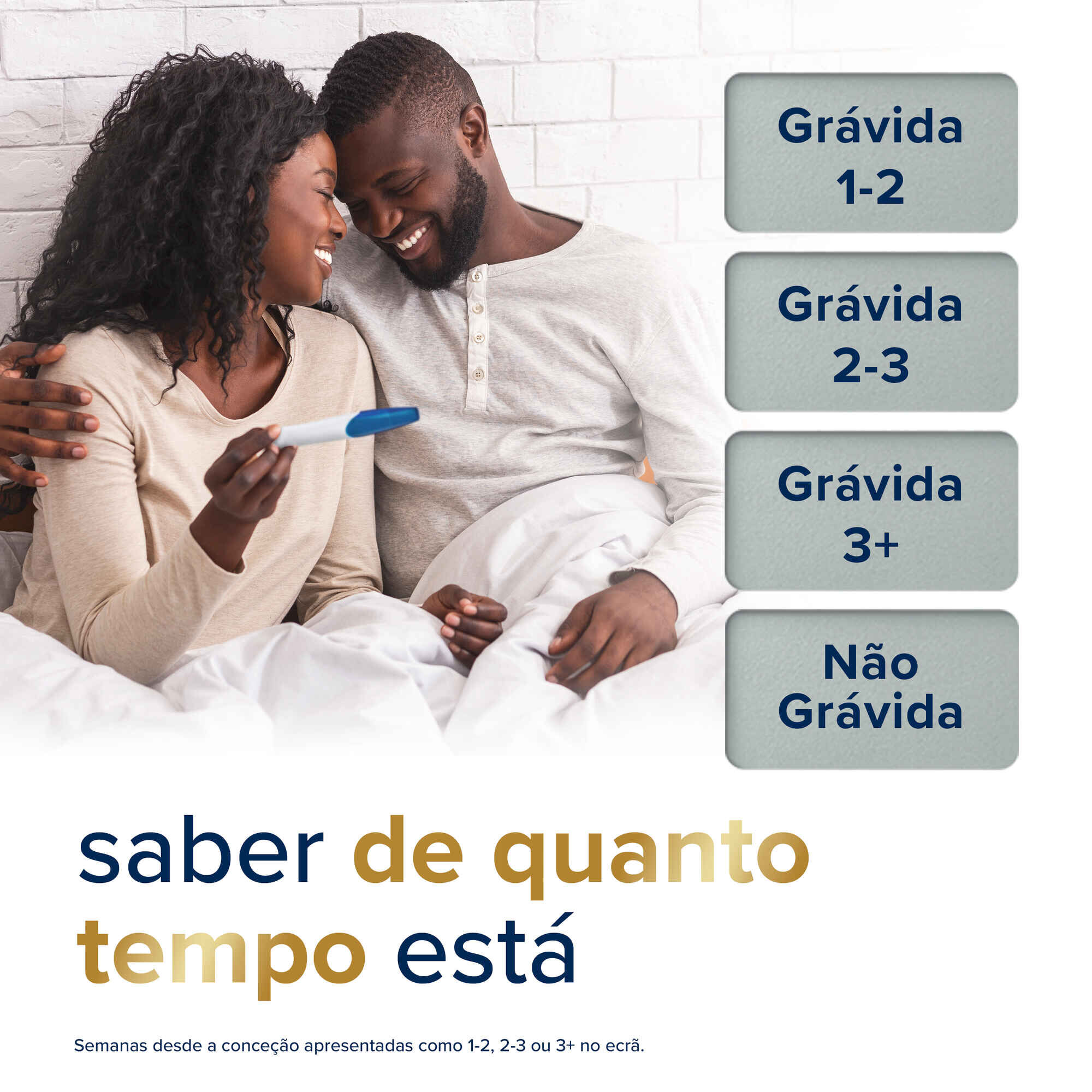 O teste de gravidez Clearblue com indicador de semanas é o primeiro e único teste tão preciso que lhe indica se está "Grávida" ou "Não Grávida" e há quanto tempo. São dois testes num, deteta a presença da hormona da gravidez com precisão, a partir do dia em que deveria aparecer o período, e também indica há quantas semanas engravidou. Dispositivo Médico.