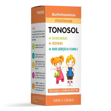 Tonosol Vitalidade é uma Solução Bebível Multivitamínica com uma fórmula completa com 100% dos Valores de Referência do Nutriente* (VRN) destas vitaminas e agradável sabor a laranja. Suplemento alimentar.