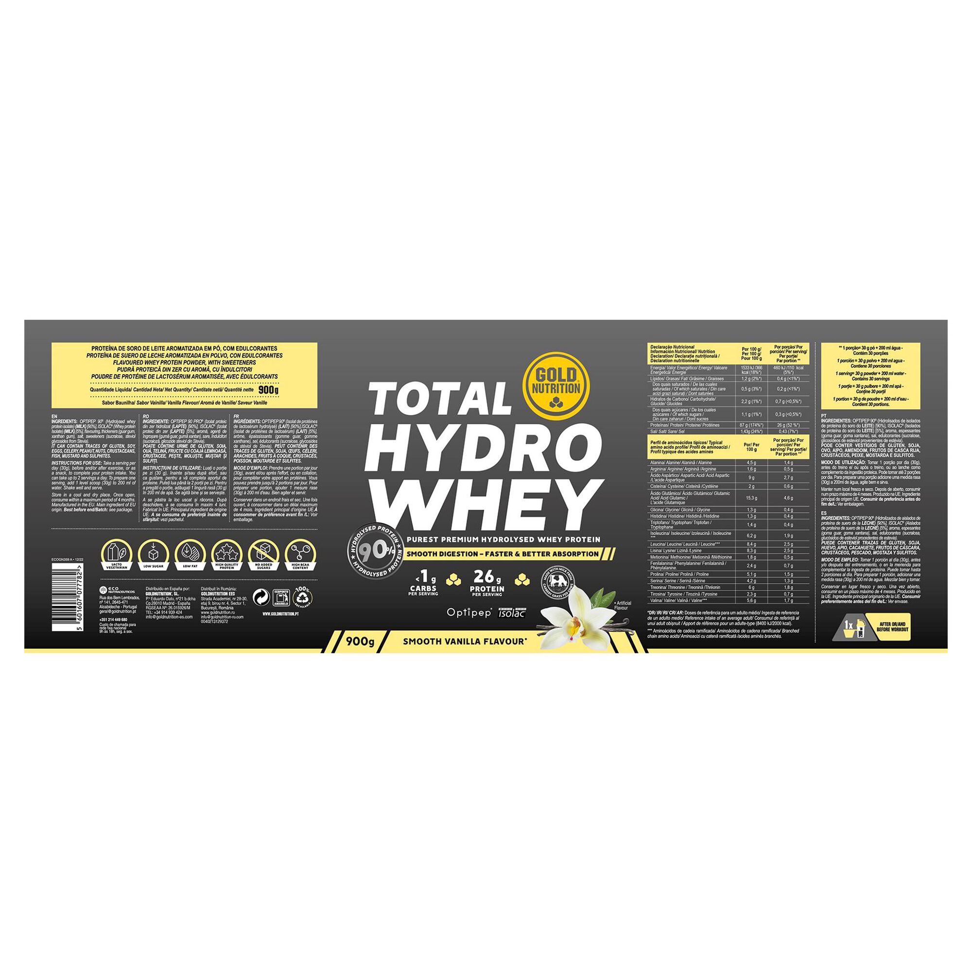 A Total Hydro Whey é uma proteína em pó composta maioritariamente por OPTIPEP® 90, a proteína hidrolisada do isolado do soro do leite. Trata-se de uma fórmula com baixo teor de hidratos de carbono, gordura e lactose, desenvolvida para quem procura uma proteína de absorção rápida e de fácil digestão. A hidrólise enzimática permite obter péptidos proteicos de elevada qualidade, tornando esta proteína adequada tanto para atletas como para quem pretende complementar a ingestão proteica diária.