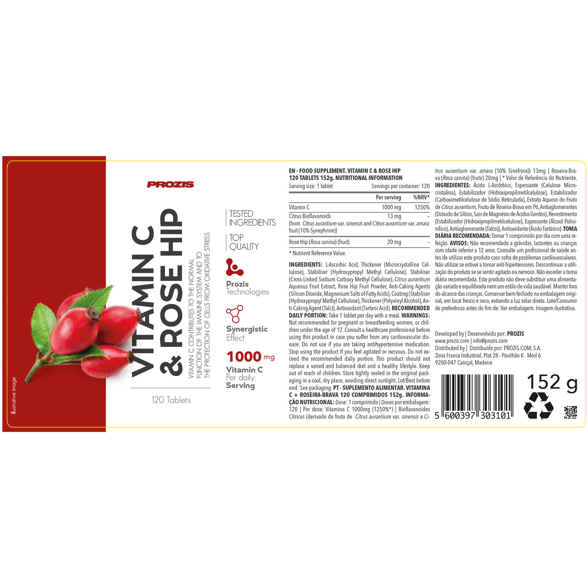 Ácido L-Ascórbico, Espessante (Celulose microcristalina), Estabilizador (Hidroxipropilmetilcelulose), Estabilizador, (Carboximetilcelulose de Sódio Reticulada), Extrato Aquoso do Fruto de Citrus aurantium, Fruto de Roseirabrava, em Pó, Antiaglomerantes (Dióxido de Silício, Sais de magnésio de ácidos gordos), Revestimento (Estabilizador (Hidroxipropilmetilcelulose), Espessante (Álcool Polivinílico Antiaglomerante (Talco)), Antioxidante (Ácido tartárico).