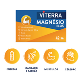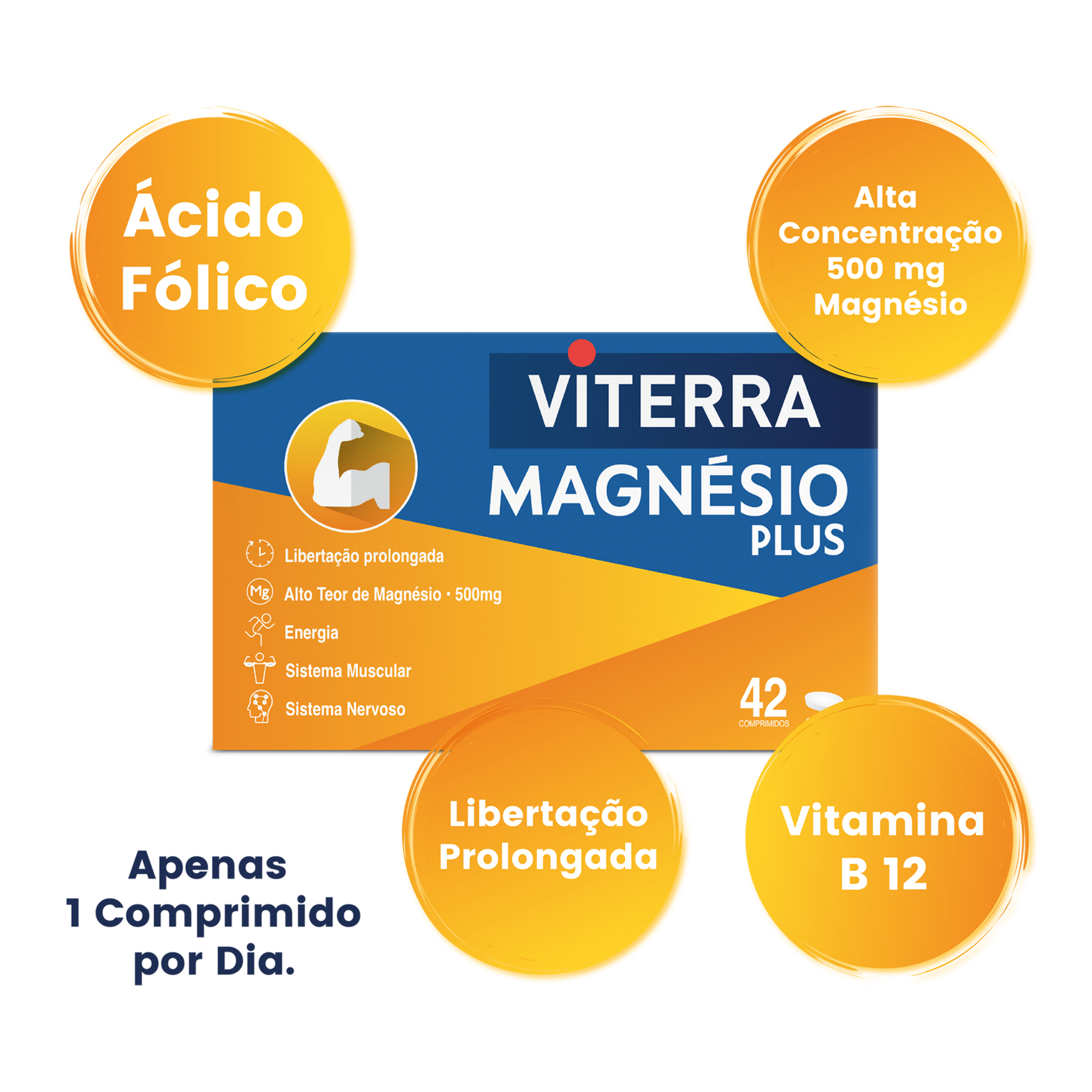 Viterra Magnésio Plus contribui para a redução do cansaço e da fadiga, para o normal funcionamento muscular e para um sistema nervoso normal. Suplemento alimentar.