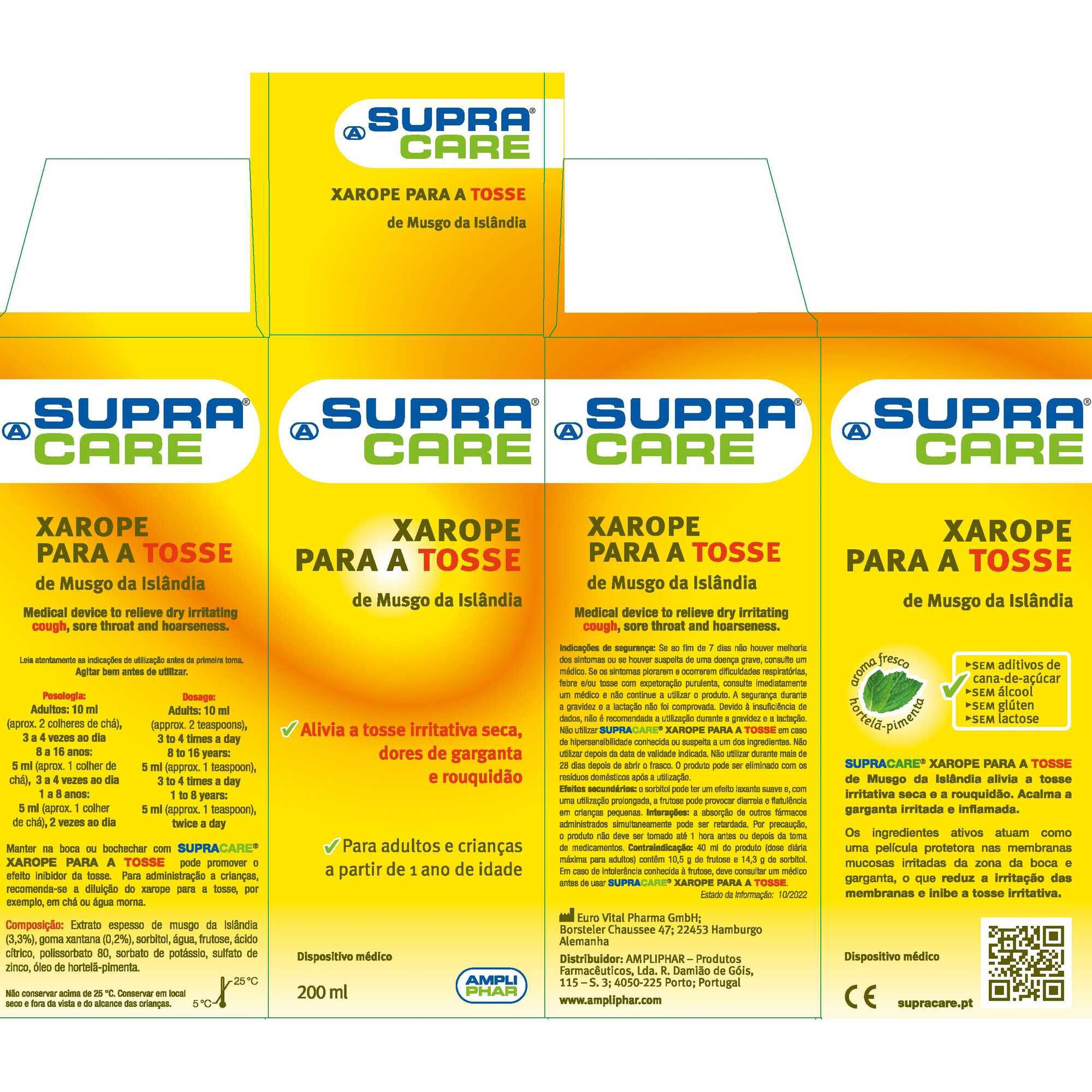 Supracare é um xarope para a tosse à base de Musgo da Islândia. Alivia a tosse irritativa seca, dores de garganta e rouquidão.